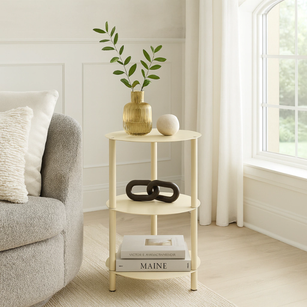 La mesa auxiliar de tres niveles en chapa y caño es práctica, versátil y fácil de integrar en cualquier ambiente. Su diseño permite colocar plantas, lámparas, libros u objetos decorativos, aportando estilo y funcionalidad a tu hogar. También puede usarse como pequeña biblioteca o mesa de apoyo indistintos rincones. Disponible en más de cinco colores, terminada con pintura epoxi al horno que garantiza mayor resistencia y durabilidad.